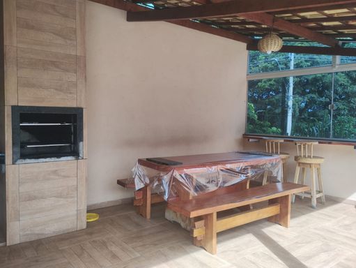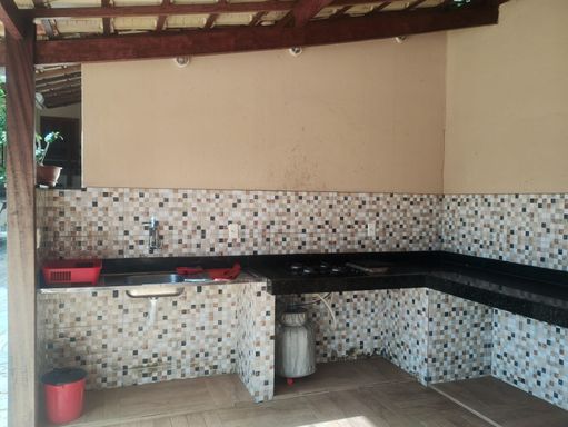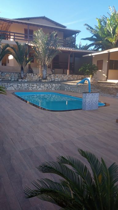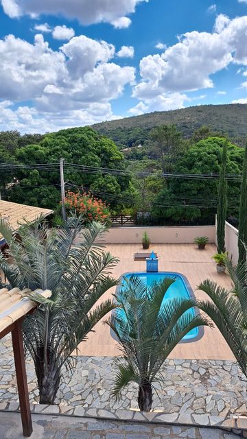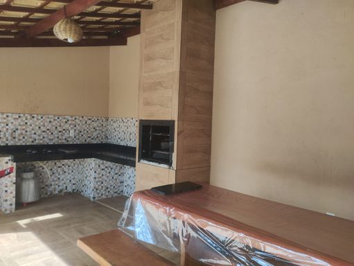 Área de lazer com piscina. cozinha, churrasqueira e fogão à lenha.